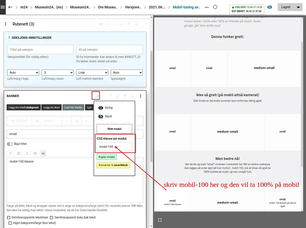 Fungerer greit fordi de to påfølgende small-modulene til sammen dekker 100% (en rad) på mobil.